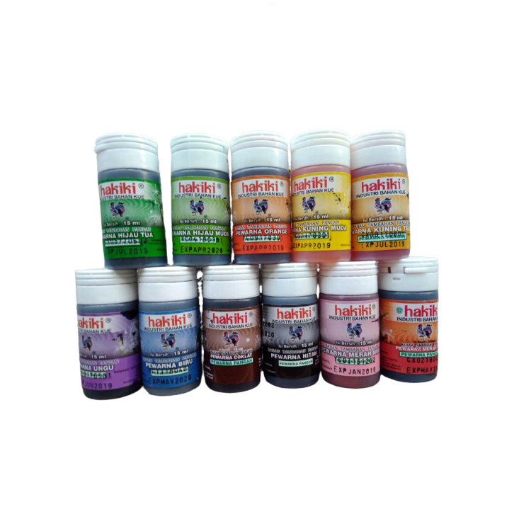 Pewarna Hakiki Kemasan botol isi 15ml All Varian HALAL MUI Food grade sehingga aman untuk dikonsumsi Warna cerah dan sangat mudah untuk diaplikasikan pada cake, coklat putih, pudding, dll.